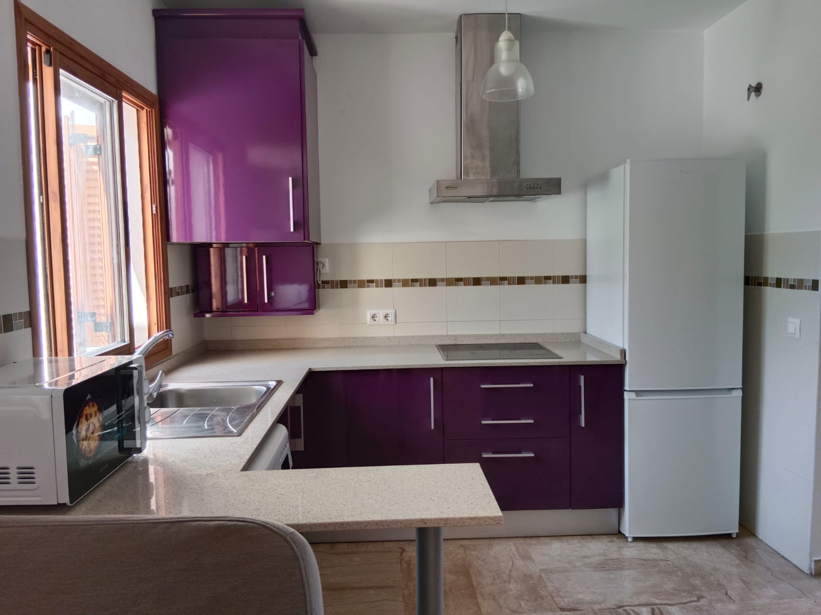 The American kitchen is fully equipped with modern appliances such as a fridge, washing machine, microwave, coffee maker, toaster, and juicer. Ideal for preparing meals and enjoying gastronomic moments with family.